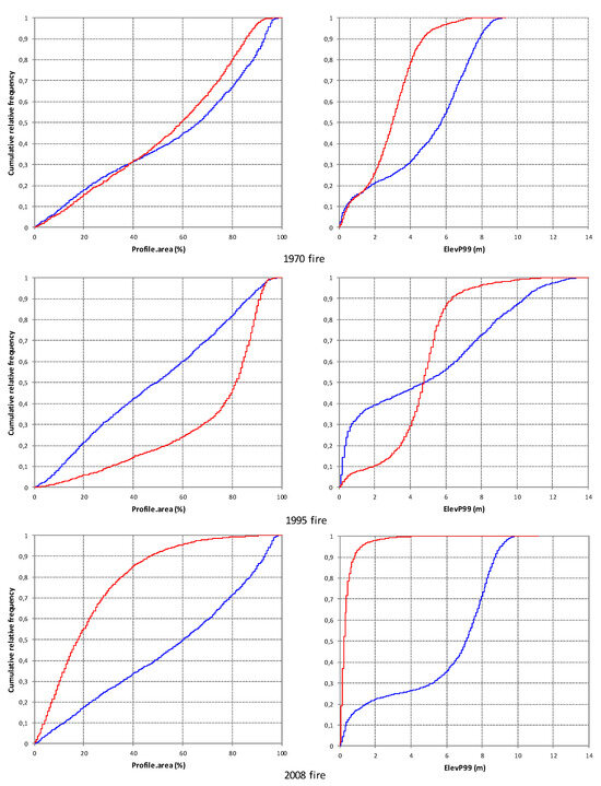 Distribution of cumulative relative frequencies (in blue Control Sectors; in red Burned Sectors) by wildfire for ElevP99 (right) and PA (left). Top: 1970 wildfire; middle: 1995 wildfire; bottom: 2008 wildfire.