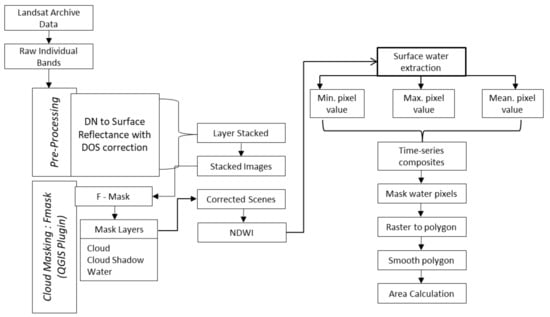 Individually processed data were stacked in layers for further processing. Landsat is an optical sensor, and the presence of clouds can have a significant impact on data quality. The cloud masking plugin (Fmask) [15] was applied to each stacked image. Fmask distinguishes between Potential Cloud Pixels (PCPs) and Clear Sky Pixels (CSPs) based on physical cloud features and removes all invalid data from the scenes. After pre-processing, the Landsat-derived Normalized Difference Water Index (NDWI) was generated to extract the surface water extent.