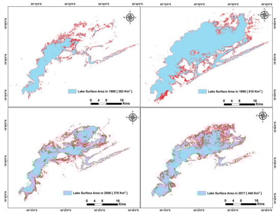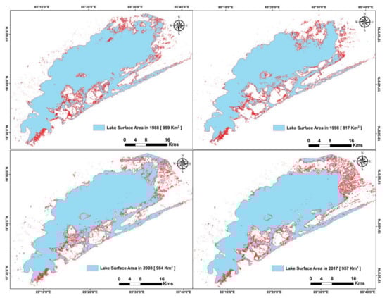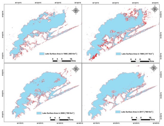 Chilika Lake surface area change maps using Max. method between 1988 and 2017.