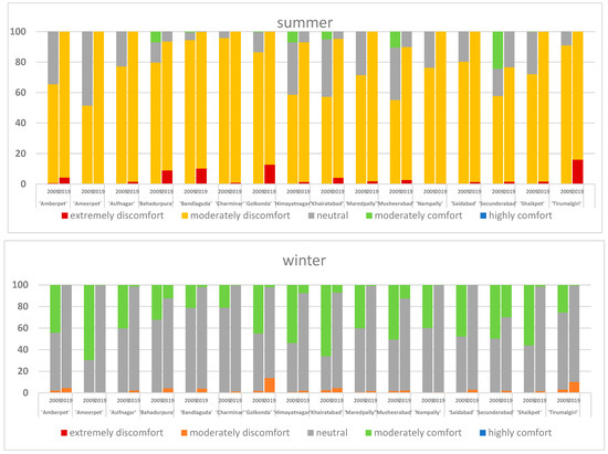 In Figure 2, the results clearly portray the fact that there was a substantial increase in the built-up area from 2009 to 2019, as well as an associated linear increase in thermal discomfort. Mandals like Secunderabad have the largest water bodies and achieve maximum thermal comfort. Again, mandals like Nampally and Charminar have the most built-up land and barren land, resulting in maximum discomfort. Similarly, in winter, most of the mandals turned to neutral conditions in 2019 from the moderately comfortable conditions in 2009. Charminar and Himayatnagar witnessed the most urbanization, resulting in discomfort.