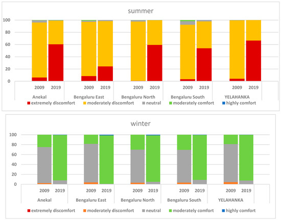 In Figure 3, every subdivision of Bangalore shows moderate discomfort in 2009, which turned to high discomfort in 2019. Very few water bodies are observed across Bangalore, resulting in very few comfortable zones throughout the city. A contrasting situation is shown in winter, where most zones of Bangalore had comfortable conditions from 2009 to 2019.