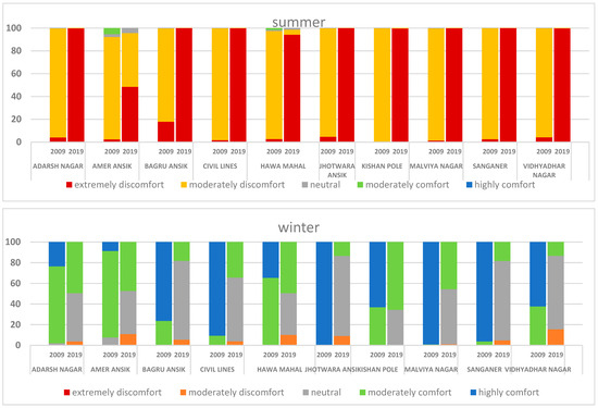 There was a slight increase in vegetation, and mostly barren land loss was observed. Figure 4 shows the ward-level thermal comfort assessment over Jaipur city. In summer, Jhotwara Ansik and Kishan Pole showed maximum discomfort from 2009 to 2019. Almost all wards exhibited moderate discomfort in 2009, which turned to high discomfort in 2019. Only Amer Ansik has a small portion of water bodies, resulting in moderate comfort and neutral conditions in 2009.