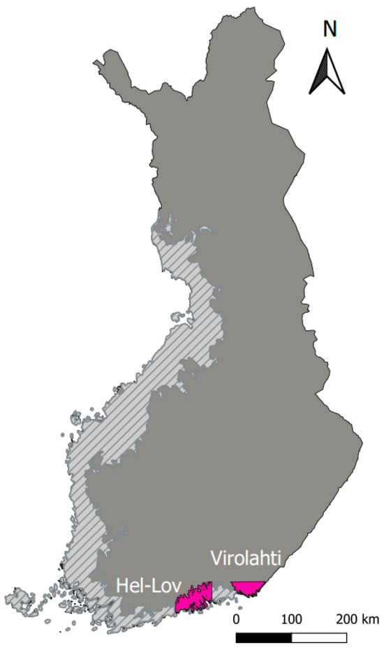 For this study, two different study areas in the south of Finland were considered: Virolahti and its surroundings, and a coastal area situated between the cities of Helsinki and Loviisa (Hel-Lov); see Figure 1. Both areas are located in the Littorina Sea, where AS soils are usually found. The land cover in these two regions mainly consists of bedrock, outcrops, and blockfields. Furthermore, the soils in both areas are similar. This has allowed us to carry out the study of this work.