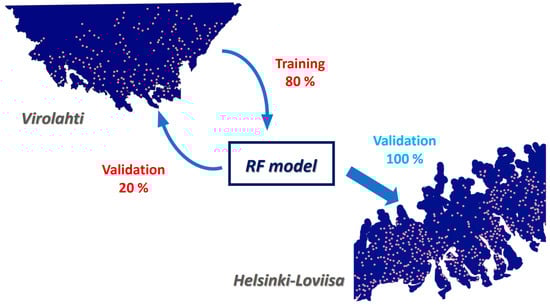 The process of this study has two steps. First, the RF model is trained and validated with the dataset of Virolahti and its surroundings. 80% of the soil samples are used for training the model and the remaining 20% for its validation (Figure 2). The next step is the validation of the model with the dataset from the Hel-Lov area. All the soil samples of this region are used for validation.