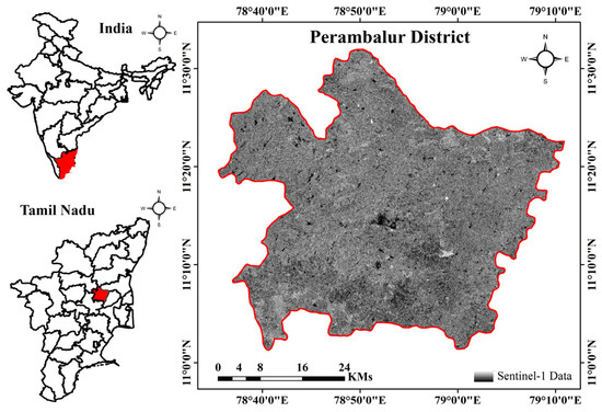 Salinity and fluoride in the soil are harmful to crops, especially mid-stage. Therefore, field surveys were conducted during cropping. To maintain field conditions, soil and water samples from 165 sites were kept in zip-lock bags, and 30 percent of the samples were considered for validation. A soil moisture kit measured volume percentage at a 5 cm depth. Laboratory tests assessed electrochemical parameters, such as electrical conductivity (EC), pH, and fluoride content, after site sample collection [19,20]. A conical flask shaker mixed the soil samples at room temperature of 24 ± 2 °C, with a 1:5 soil–field water ratio for over 30 min. Finally, a conductivity probe was coupled to a pH/EC Metre network and analysed at 4 to 6 GHz frequency, and a spectrophotometer measured EC, pH, dielectric components, [14] and fluoride. Laboratory research showed that water bodies in Perambalur lost more fictitious water to agricultural patches, which was analysed from the water obtained from varied soil and mineral sources. The study area map of the Perambalur District in India is illustrated in Figure 1.