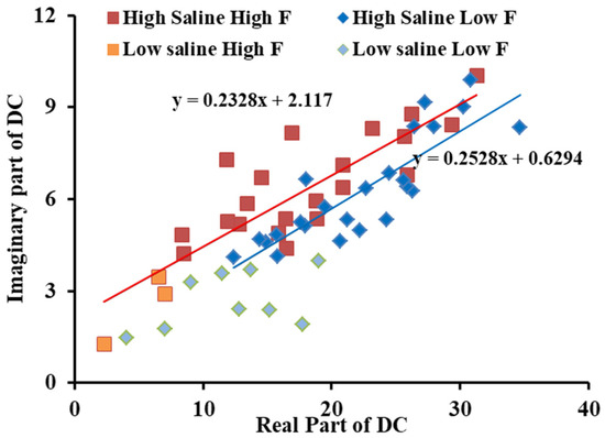 The absence of free water makes estimating the imaginary part of dielectric loss difficult. Thus, high saline conditions are used to calculate fluoride content. High saline/high fluoride and high saline/low fluoride soil sample data were measured in the lab. High saline/low fluoride soil is considered non-fluoride saline, with fluoride having a minor influence, while high saline/high fluoride has a greater effect and helps define a dielectric constant. A 2D plot between the real and imaginary parts of fluoride helps estimate conductance losses due to fluoride and can be quantified. The imaginary part of soil fluoride is estimated as a function of real and imaginary parts of the dielectric constant and the tangent loss, as shown in Equation (5). A linear relationship between in situ soil fluoride and the imaginary part of fluoride shows fluoride values in mg/kg. The relationship between the real and imaginary parts of the dielectric constant is visualized in Figure 2, specifically through the tangent loss.