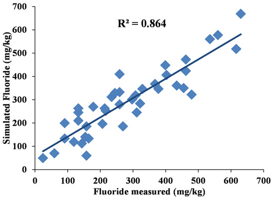 Depending on ionic conductivity, soil pH is acidic or alkaline. A hypothetical chunk of fluoride-affected soil was segregated from tangent loss to distinguish it from non-fluoride soil. The dielectric constant of soil with total salts and fluoride was 0.81 and 0.86, respectively. The fluoride present in the soil ranged between 42 to 573 with an RMSE of 1.90 and positive bias of 0.35, as well as a significance level of 0.005. The model’s accuracy was affected by over-estimating total salt and fluoride salt in the lower real and imaginary portions. Outliers were removed to determine the model’s accurate range, and it performed well in real and imaginary part ranges above 2. Fluoride ranged from 0 to 200 mg/kg, a model with an R2 of 0.81 performed well, and STI values less than 0.2 were exaggerated in large amounts. An STI of 0.2 to 0.4 was significantly exaggerated, and fluoride was between 201 and 400 mg/kg. The plot showed good agreement; the STI results were between 0.4 and 0.7, the range of fluoride was 401 mg/kg to 600 mg/kg, and the STI values above 0.7 were underestimated; the value was larger than 601 mg/kg. From this, it was possible to conclude that soil texture played a major role in fluoride contamination due to the amount of sand and clay. Figure 4 illustrates the validation of the simulated fluoride levels compared to the estimated fluoride levels obtained through conventional methods.