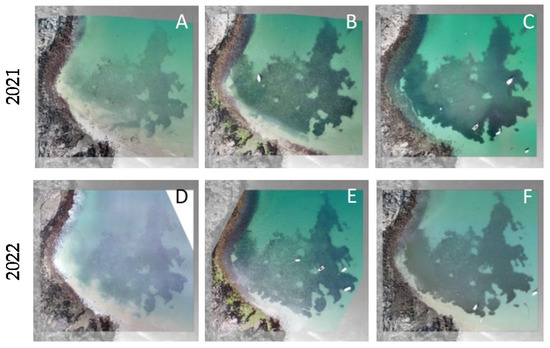 Orthomosaics Red-Green-Blue of the seagrass meadow of La Varde on 1 March 2021 (A), 27 May 2021 (B), 6 September 2021 (C), 3 February 2022 (D), 16 May 2022 (E) and 11 October 2022 (F).