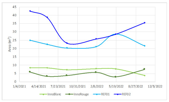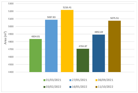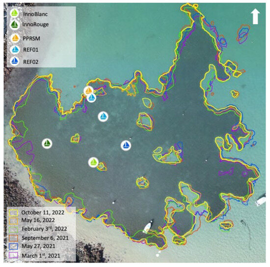 Analysis of the results on a seasonal scale highlights a shrinkage of the meadow during the winter period and an expansion during the summer period, i.e., a differential of 382.4 m2 between March and September 2021, and 370.64 m2 between February 2022 and October 2022 (Figure 4). These temporal variations might be explained by the sensitivity of the Zostera marina L. species to variations in sedimentation and turbidity, which are more pronounced in winter due to the higher level of hydrodynamism at this period of year [7].