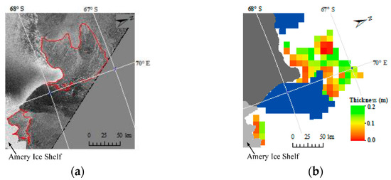 Antarctic coastal polynyas are open-water or thin-ice regions formed by a divergent ice motion because of offshore winds or oceanic currents; they usually appear regularly in the same locations in winter [1]. Due to the poor heat insulation of thin ice in winter, intensive heat loss in the atmosphere occurs in Antarctic coastal polynya areas and leads to the formation of sea ice [2]. Antarctic coastal polynyas are important producers of sea ice, and about 10% of sea ice in the Southern Ocean is produced from Antarctic coastal polynyas [3]. When a large amount of sea ice is produced in the Antarctic coastal polynyas, salt, originally in the seawater that later froze into sea ice, precipitates and then dissolves in the surrounding seawater to form a very dense brine, which is a major source of the world’s densest water whose name is Antarctic bottom water (AABW) [4,5]. Therefore, studying the variability of the time series of sea ice production (SIP) in Antarctic coastal polynyas helps to better estimate the associated AABW production. Recent studies found that polynyas in the Amery Ice Shelf, which is located on the East Antarctic coast, are major areas of SIP and AABW production in the Antarctica [6,7]. In addition, between 20 and 25 September 2019, the Amery Ice Shelf collapsed, which caused the disintegration of an area of 1636 km2, which is roughly twice the size of New York City. As a result of the collapse, the large iceberg D28 broke away from the Antarctic continent and slid into the ocean. There is a great need to study SIP in the Amery Ice Shelf during the collapse event and in the years preceding it.