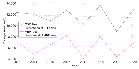 Overall, the trends showed that both polynya areas tended to decrease, with small fluctuations, and that the CDP and MBP variations were relatively consistent over the 2013–2020 period, with the exception of the 2014–2015 period, when the CDP extension tended to decrease, whereas the MBP extension showed the opposite trend. All other years showed relatively consistent increasing and decreasing trends. Both CDP and MBP showed large fluctuations. The year with the largest annual mean area of the CDP was 2018, with an annual mean area of 13,588 km2, while the smallest annual mean area of the CDP was detected in 2019 and was about 9850 km2; the year with the largest annual mean area of the MBP was 2016, with an area of 8150 km2, while the smallest annual mean area of the MBP was reported in 2017 and was about 4075 km2.