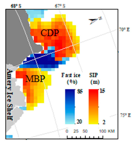 The annual mean SIP in the Amery Ice Shelf was calculated, and the spatial distribution of SIP was mapped, as shown in Figure 3. In the CDP region, SIP was higher in the area near the eastern fast ice and shelf and in the central area, while it was lower in the relatively outlying areas to the west and north. In the MBP region, SIP was higher in areas close to the Amery Ice Shelf and lower in areas to the north and east.