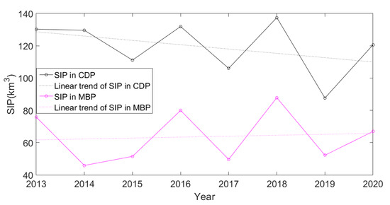 The annual SIP in the CDP and MBP showed a relatively consistent trend, in high agreement with the general trend in the area, as shown in Figure 4. Overall, the annual SIP in the two polynyas fluctuated widely, with the overall trend of SIP fluctuating downward for the CDP and upward for the MBP. SIP in the CDP was generally larger than in the MBP, with the highest SIP occurring in 2018, when it was up to 137.5 km3, and the lowest SIP occurring in 2019, when it was about 87.6 km3. MBP’s highest SIP was about 87.9 km3 in 2018, and its lowest SIP was 45.9 km3 in 2014. Both CDP and MBP reached a maximum SIP in 2018.