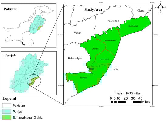 For this study, District Bahawalnagar was selected, located in the southern part of the Punjab province of Pakistan. It is bordered by India and the districts Okara, Pakpattan and Bahawalpur in Pakistan, as shown in Figure 1. The climate of District Bahawalnagar is arid, with hot summers and cold winters. The average temperature ranges from 25 degrees Celsius in January to 40 degrees Celsius in June. The average rainfall is 200 mm per year. The economy of District Bahawalnagar is primarily based on agriculture. District Bahawalnagar faces a number of challenges including water scarcity, land degradation, and climate change. The district is also experiencing rapid population growth, which puts a strain on resources. Despite these challenges, District Bahawalnagar has great potential. The district has a rich agricultural heritage and a number of tourist attractions.