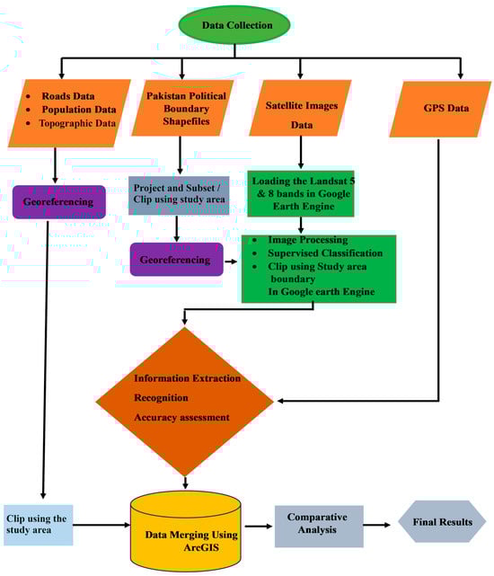 The methodology employed for classifying land into the four respective land cover classes followed a supervised approach, specifically utilizing the maximum likelihood algorithm. Spectral signature maximum likelihood classification is a supervised classification algorithm that uses training data to classify pixels in a remote sensing image. The training data consists of pixels that have been labelled with their known land cover classes. The algorithm uses the spectral signatures of the training pixels to calculate the probability that each pixel in the image belongs to each land cover class. The pixel is then assigned to the land cover class with the highest probability. The maximum likelihood algorithm is a powerful classification algorithm that can be used to classify pixels in remote sensing images with high accuracy. However, it is important to note that the accuracy of the classification depends on the quality of the training data and the spectral variability of the land cover classes. This algorithm was chosen due to its effectiveness in handling multispectral data from Landsat TM and ETM+ sensors, which were selected for their favorable spectral and temporal resolution, as well as their moderate geographic resolution [13,14]. To conduct this study, a diverse range of data sets from various sources, each in different formats, were collected. Different software programs were employed to combine these data sets and facilitate the analysis. The methodology flowchart of LULC classification in District Bahawalnagar is depicted in Figure 2.