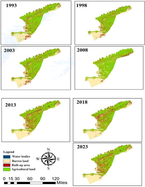 Following the completion of the supervised categorization process, a total of four primary land use classes were obtained. Water bodies, bare land, built-up areas, and agricultural land are included. LULC data for the years 1993 through 2023 are depicted in Figure 3.