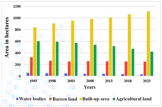 Graphical illustration of land occupied by the four LULC classes in District Bahawalnagar over the years.