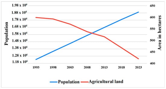 There is a discernible trend in land utilization and coverage whereby agricultural areas are being progressively transformed into residential and commercial zones. The economic justifiability of this transition falls outside the purview of the present investigation. The demand for more infrastructure in District Bahawalnagar has arisen because of the steady growth in population over the years. To facilitate a rough comparison, we have depicted the trends in agricultural land and population in Figure 5. The analysis of population data in Bahawalnagar reveals a discernible pattern of variation in land use for agriculture over the course of this research, as depicted in Figure 5. The proportion of agricultural land within the research area experienced a substantial decline over the period spanning from 1984 to 2013, specifically decreasing from 39.7% to 15.8% of the total land area. The population has exhibited a notable growth trajectory, ascending from 1,234,567 individuals in 1993 to 1,890,123 individuals in 2023. This is an increment of 655,556 individuals, which corresponds to a percentage increase of 53%. The agricultural land area has seen a decline from 598,779 hectares in 1993 to 420,145 hectares in 2023, representing a reduction of 178,634 hectares or 30%. The current trajectory of agricultural land in Bahawalnagar suggests that there will be a substantial decline in agricultural food production in the future unless appropriate measures are implemented to enhance crop farming practices. One potential remedial measure that can be used is the practice of spatial optimization, which aims to effectively allocate land use and land cover classes. It is suggested that a comparison analysis be carried out to clarify the observed fundamental shift away from agriculture in Bahawalnagar. This research should focus on examining the returns generated by agricultural products in relation to alternative investments such as residential and commercial structures, among others.