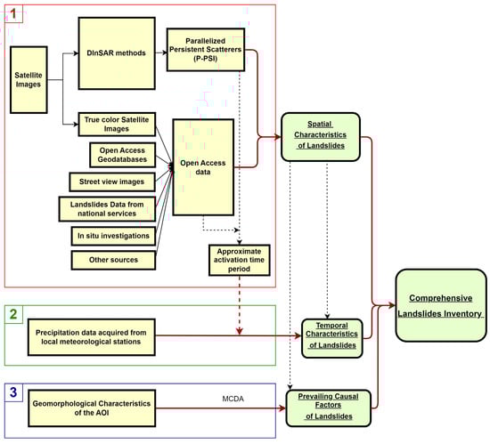 The methodological framework proposed by this study is depicted in Figure 1. As shown, in order to create a complete landslides inventory, the spatial and temporal characteristics of the landslides were combined with the prevailing factors that triggered their activation. The framework consists of three main steps.