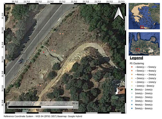 By using Sentinel-1 satellite images and the P-PSI technique, 290,000 Permanent Scatterers (PSs) were identified for the ascending orbit and 380,000 PSs for the descending orbit in the AOI. Based on the resulting PSs Line of Sight (LOS) displacements and the visual data acquired for these locations, 236 new landslides were identified. For instance, as illustrated in Figure 2, based on LOS displacements in the Kandanos region, a landslide was initially identified. It must be noted that Figure 2 illustrates a specific and limited region of the AOI, where only a few PS were identified. Therefore, it depicts only the relative classes of these particular PS, as resulted by the PS clustering. However, the legend of the figure encompasses the PS classification, using the red, green blue (RGB) color range, which was followed across the entire AOI. Subsequently, as shown in Figure 3, the landslide was verified using Google Earth historical images and street view images. Additionally, an approximate time range for the landslide’s activation was established.
