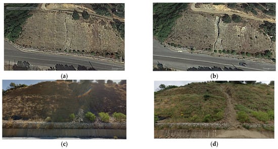 Identifying a landslide in Kandanos region, in the Chania regional unit, Crete Island, Greece. Images (a,b) were taken from the Google Earth satellite view in 2013 and 2019, respectively. Visual data were provided by google street view in 2014 for (c) and 2019 for (d) [10].