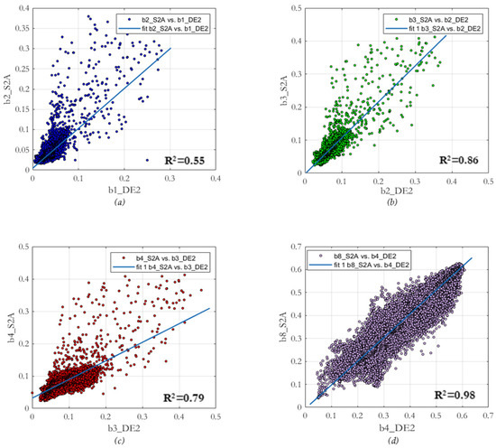 - The second procedure relied on a regression analysis between the corresponding bands of both products, fitting a linear function to the two datasets. In this analysis, the regression coefficient (R2) and the fitting error (RMSE) are obtained, where the latter can be interpreted as a deviation from the fitted function.