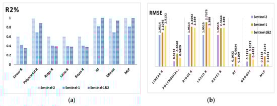 This figure shows the results of the eight machine learning algorithms when using only optical images, only radar images, and both optical and radar images. (a) The R2 values are expressed as percentages for the different models. (b) The RMSE values are expressed in tons per hectare for the different models.