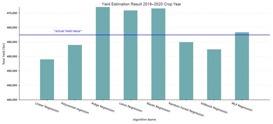 As depicted in Figure 2, the closest estimate to the annual statistical yield reports was achieved by the MLP algorithm, given its complexities and more accurate responses. Another noteworthy observation is the estimated values produced by the Bayesian, Lasso, and Ridge algorithms, which rely on statistical methods. All three algorithms estimated values higher than the actual crop yield, attributed to their similarity in the underlying statistical approaches. The estimated values by Random Forest and Polynomial Regression algorithms were also close to the actual values. Linear Regression yielded the lowest crop yield estimate, while Ridge Regression provided the highest estimate.
