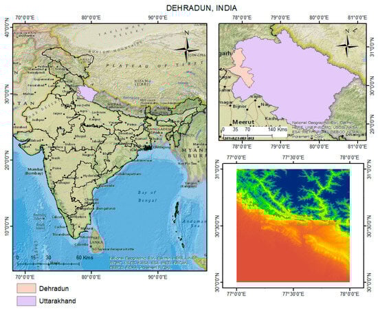 This study was conducted over the hilly terrain of the Dehradun region in the foothills of the Himalayas. The study area lies between latitudes 30°01′ N and 31°2′ N and longitudes 77°34′ E and 78°18′ E (