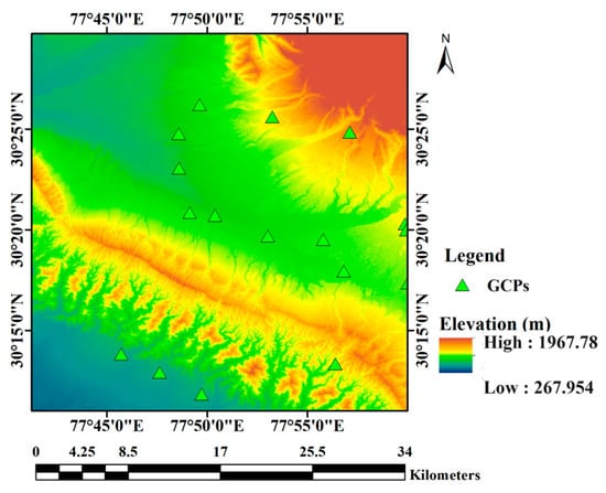 The Trimble R7 GNSS receivers and Leica 500 series receivers were used for the collection of the field data. A total of 16 GCPs were collected over the Dehradun region and utilized for the validation of the simulated DEM.