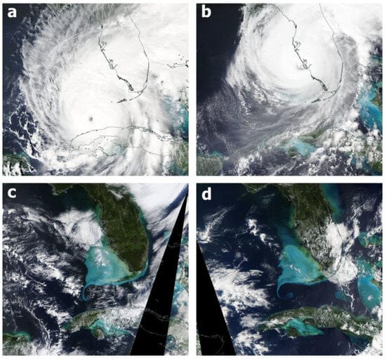 Images of the passage of Hurricane Ian over the West Florida Shelf. (a) 27 September 2022, MODIS–Aqua. (b) 28 September, NOAA-20 VIIRS. (c) 30 September, MODIS-Terra. (d) 1 October, MODIS–Aqua.