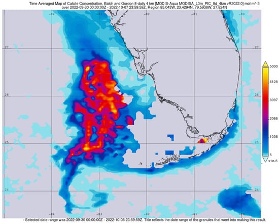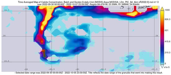 MODIS–Aqua 8-day PIC data image for the period 30 September–7 October 2022, visualized with Giovanni. High values of the PIC variable over the West Florida Shelf are attributable to sediment suspension and bottom reflection.