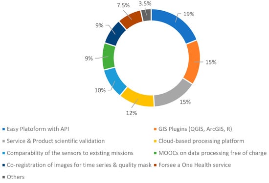 In the subsequent graph (Figure 1), the most desired or existing aspects in remote sensing portals and implementations, crucial for addressing issues starting from question 6 of Table 2, are depicted as a percentage of all comments received in the RSC.