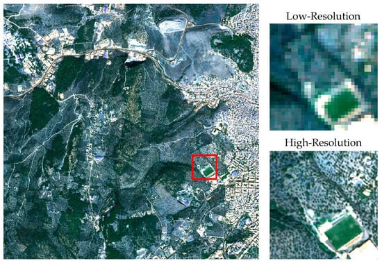 Satellite remote sensing is used in various practical domains, such as mapping, agriculture, environmental protection, land use, urban planning, geology, natural disasters, hydrology, oceanography, meteorology, and many more. In this field, the spatial resolution is a fundamental parameter that is of particular importance for two reasons. The higher the resolution of an image, the more details and information are available for human interpretation and automated machine understanding [1]. However, the goal of providing high spatial resolution devices at the market price is not always the optimal solution [2]. In the past two decades, super-resolution (SR) has been defined as the process of reconstructing and generating a high-resolution (HR) image from one or more low-resolution (LR) images. The challenge with the SR process is fundamentally that it is an ill-posed problem. This means that a single LR image can be derived from several HR images with minor variations, such as changes in camera angle, color, brightness, and so on [3]. Therefore, various approaches have been developed with different constraints and multiple equations to map an LR image to an HR image.