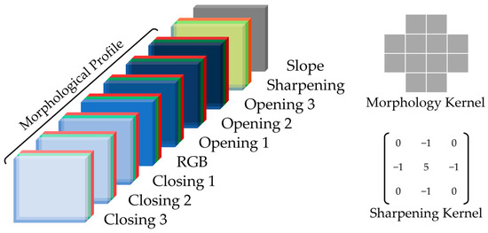 In our proposed method, by extracting spatial features, such as the morphological profile and sharpening operation, we tried to reduce the pixelation in super-resolved images. Morphological analyses are designed using various shapes to extract information present in the form of spatial relationships between pixels. One common method in employing morphological analyses is to create a morphological profile. This means that different morphological operators are first applied to the image, and then their results are arranged alongside each other based on a specific pattern and utilized in a computational model [12]. In this study, we employed two morphological operators, Opening and Closing, to generate the morphological profile. For each of the three RGB spectral bands, these operators were applied three times, and their results were arranged sequentially, as shown in Figure 2.