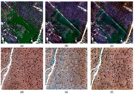 Visual comparison (RGB) of Worldview images (a,d), images super-resolved by the proposed model (b,e), and images super-resolved by ESRGAN (c,f); the values of PSNR, SSIM and SAM are provided, respectively: (b) 38.07 dB/0.93/0.16 rad., (c) 37.89 dB/0.93/0.16 rad., (e) 34.80 dB/0.84/0.12 rad., (f) 37.91 dB/0.91/0.09 rad.