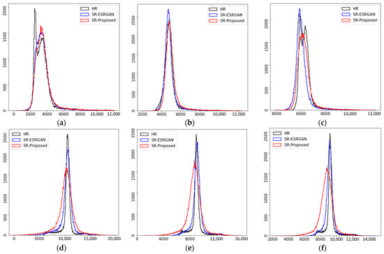 Comparison between the histograms of the red (a,d), green (b,e), and blue (c,f) bands from the images in Figure 3. In each histogram, black, red, and blue colors correspond to worldview images, images super-resolved by the proposed model, and images super-resolved by ESRGAN, respectively.