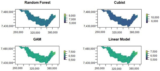 The spatial downscaling methodology used in the present study was proposed by Malone et al. [5], who originated the Caret package in R language. In this methodology, the authors use coarse grid spatial data for fine grid mapping using predictive covariates and the random forest (“rf”), cubist (“cubist”), MARS (“earth”), and linear model (“lm”) regression models.