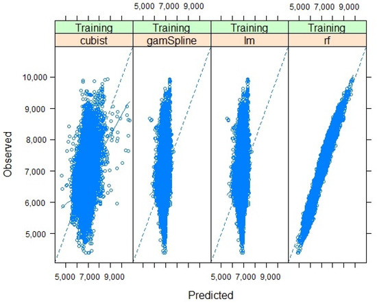 Figure 3 and Table 1 illustrate the performance of each model according to observed values versus predicted values.