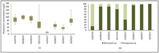 (a) Boxplot of the phycocyanin concentrations obtained for different measurements performed in 2016 and 2017; (b) proportion of the main blooming cyanobacterial genera.