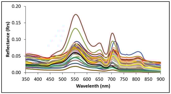 Rrs spectra acquired from Lake Qaraoun (Different color lines represent measurements at different sites and/or dates).