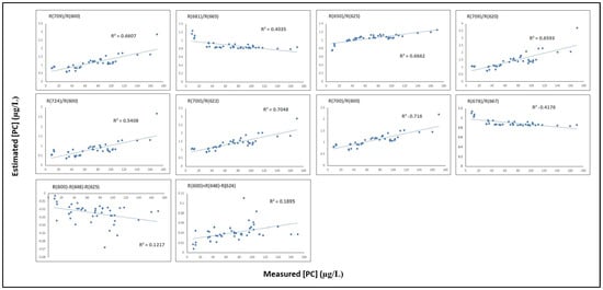 Scatter plots representing the estimated [PC] from each algorithm verses measured [PC] (µg/L).