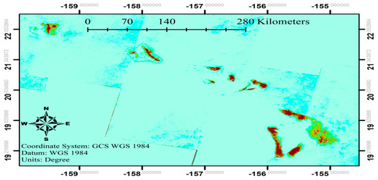 The Hawaiian archipelago is located in the central Pacific Ocean and is the southeast- ern part of the Hawaiian–Emperor chain (Figure 1). These islands were formed by a stationary hotspot that created volcanic islands on the Pacific plate, which moves toward the north- west [20]. The Big Island, Hawaii (21° N, 156° W), is the youngest and most southeast island in the Hawaiian archipelago. Over millions of years, the archipelago has sunk due to the weight of volcanic activity associated with this hotspot [21].