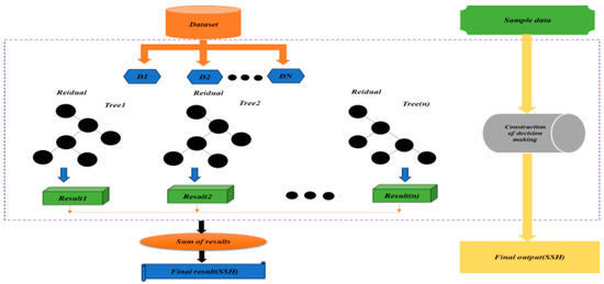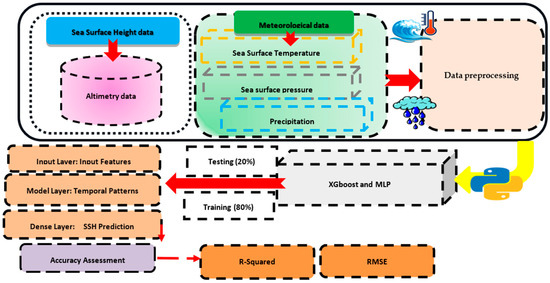 The sea surface height (SSH) data obtained from Jason-2 were sourced from the Ar- chiving Validation and Interpolation of the Satellite Oceanographic Data Center (AVISO). The along-track SSH data have a spatial resolution of approximately 6–7 km, with the satellite ground track repeating every 10 days [22]. Using BRAT software 4.2.1 [23], the 36 J-2 data in 2019 were processed. Also, the SSH for a region near the Hawaiian island was extracted and showed a rising trend. We utilized the sea surface temperature (SST), sea surface moisture (SSM), and sea surface precipitation (SSP), which were created by using the GEE cloud-based platform as an input, while the target variable for prediction was the sea surface height (SSH). Inverse Distance Weighting (IDW) [24] in the ArcMap software interpolation was used to estimate the SSH values between the available data points. We employed the XGBOOST [25] and MLP [26] algorithms to model and predict the SSH. In Figure 2, you can find more information regarding the methodology of this search. Furthermore, both Figure 3 and Figure 4 illustrated the architectural of MLP and XGBOOST models.