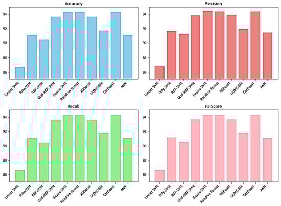 Another noteworthy finding is the significant performance boost obtained through hyperparameter tuning, particularly with Bayesian optimization. This was evident in the improvement in the SVM models, with Bayes-SVM reaching an impressive accuracy of 94.27% and the overall best precision and recall of 94.46% and 94.27%, respectively, which is comparable to those of the top-performing ensemble methods. This demonstrates the importance of fine-tuning the model hyperparameters to obtain the best possible performance from machine learning algorithms.