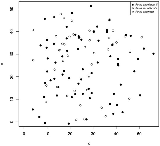 The study was conducted in the mixed and irregular forests of the Sierra Madre Occidental of Durango (Figure 1), more precisely in the longitudinal gradient between the states of Durango and Sinaloa, from September to November 2017. Six plots, 50 m × 50 m (0.25 ha), were established, where the diameter at breast height (DBH) was measured, growth rings were analyzed to describe the age and diameter increments of each tree based on growth nuclei, the pines were located within the plot, and the species were recorded. For the analysis presented here, we applied the methodology only to the species found in plot 5 (Figure 2), which had the largest number of individuals.