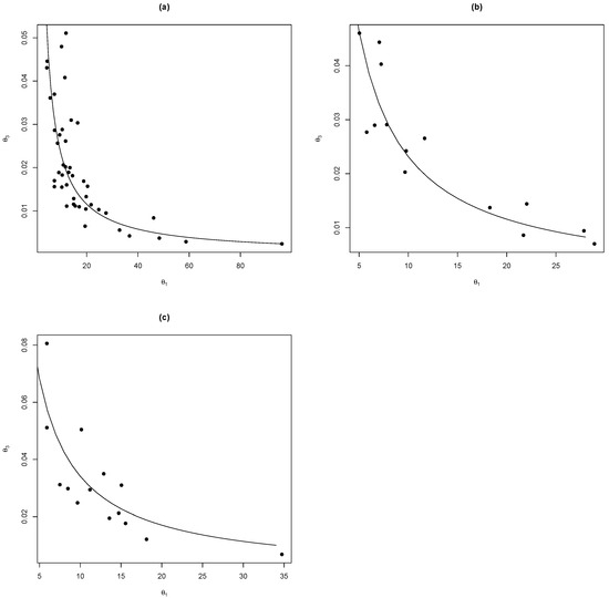 The relationship between the parameters and adjusted for the model , for the species (a) Pinus engelmannii (, ), (b) Pinus strobiformis (, ), and (c) Pinus arizonica (, ).