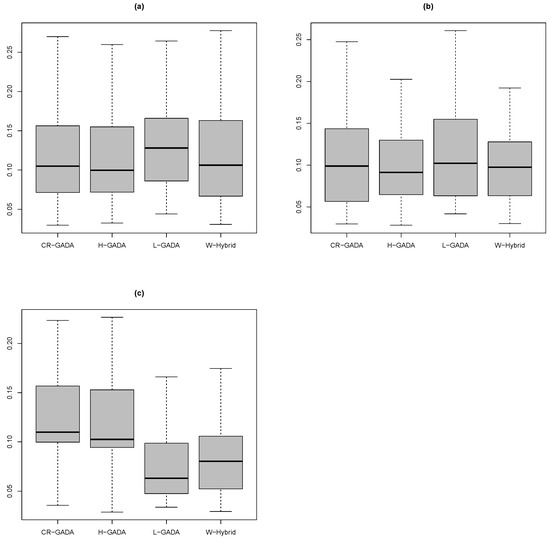 The tests show that the results for the MAPE function calculated for the C-R GADA, Hossfeld GADA and the proposed methodology were equivalent (Figure 4), considering each of the species analysed in this study. The results were: Pinus engelmannii (Wilcoxon–Mann–Whitney test, p-value ), Pinus strobiformis (Wilcoxon–Mann–Whitney test, p-value ), and Pinus arizonica (Wilcoxon–Mann–Whitney test, p-value ). There are small advantages for the proposed methodology for the species Pinus engelmannii () and Pinus arizonica (), if we are considering only the mean MAPE (Table 3).