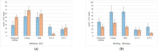 Total working operation times (min ± standard error), (a) by the operating method and by (b) cultural operation (D.T.A = delay time avoidable; D.T.U. = delay time unavoidable).