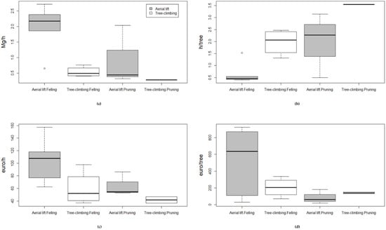 Distribution values of systems by work operations in the 14 observed yards. (a) Productivity (Mg h−1); (b) gross time (h tree−1); (c) hourly cost (€ h−1); (d) unitary cost (€ tree−1). Sample size (n): aerial lift by felling: n = 5; tree-climbing by felling: n = 4; aerial lift by pruning: n = 3; tree-climbing by pruning: n = 2 (box limits represent: 25 and 75 percentiles; line within box: median; whisker ends: minimum and maximum; circles outside the box: outliers).
